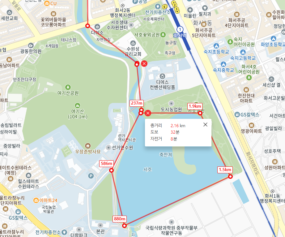수원성감리교회 뒷길로 빠지면 화서역으로 갈 수 있는데, 이어진 길로 벚꽃을 쭉 따라 걷다 보면 어느새 서호 입구까지 오게 된다. 조금 여유가 된다면 서호까지 가보는 것도 좋다. 저수지 규모가 꽤 커서 과장 좀 보태 유사 석촌호수 비스무리한 기분을 낼 수 있다. 서호 입구에 있는 벚꽃폭포의 늘어진 벚꽃가지가 볼만하다. 관리도 잘 돼서 물냄새도 없고 화장실도 깨끗하다.