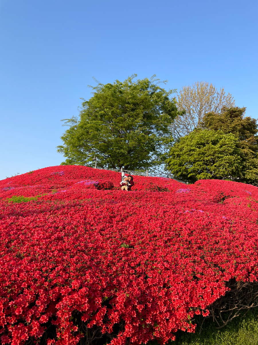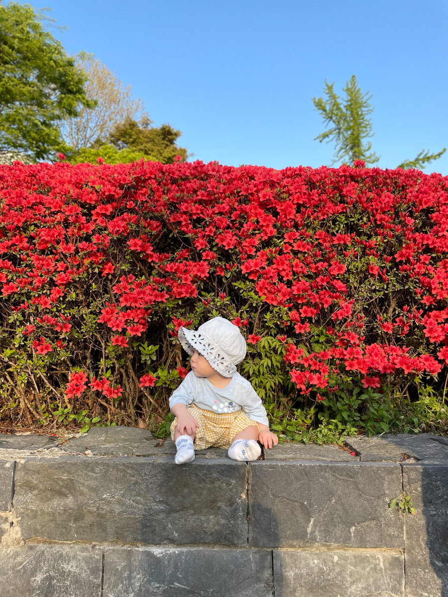 벚꽃을 놓쳐 아쉽다면 빨간 꽃(이름을 모르겠다)이 위로를 해준다. 벚꽃비까지 내리고 나면 빨간 꽃이 서호 공원에 핀다. 사진 스폿은 숙지중학교 쪽으로 올라가는 육교다. 여기서 덕이 아기 때 인생샷 많이 건졌다.